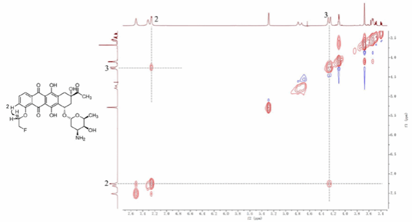 800 兆核磁共振波谱仪于2024年1月安装完成并迅速投入使用,平台朱孔营老师、邓小娟老师与课题组师生进行了充分的沟通,了解测试需求,针对该样品进行了细致的实验方法优化,克服了样品浓度低、杂原子阻断耦合相关、常用的COSY、HMBC等二维谱均不能观测到有效的相关峰等相关问题,利用水峰压制的二维NOESY谱图,压制水峰减少溶剂干扰,从而增强了相关信号峰强度,成功观测到氟乙氧基与苯环的NOE相关峰。结合一维谱和二维谱对谱峰进行归属,有效解决产物取代基位置确认问题,为氟化物的结构鉴定提供了精准服务和高效技术支撑。为此作者在论文中表示感谢,这也是800兆核磁共振自2024年1月试运行以来支撑发表的第一篇高水平成果。