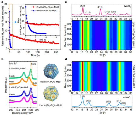 以CO和H2O为原料的水煤气变换(WGS)反应是工业上生产高纯H2的重要途径,其实现需要在低温条件下具备高活性以及稳定性的WGS催化剂。孤立Pt单原子(Pt1)及亚纳米的Pt团簇(Ptn)共同负载 α 相碳化钼(α-MoC)催化剂(Pt1–Ptn)/α-MoC),能在313K的低温下催化WGS反应。通过原位XRD和原位XPS揭示了2 wt% Pt/α-MoC催化剂在催化WGS反应中高活性及稳定性的原因。