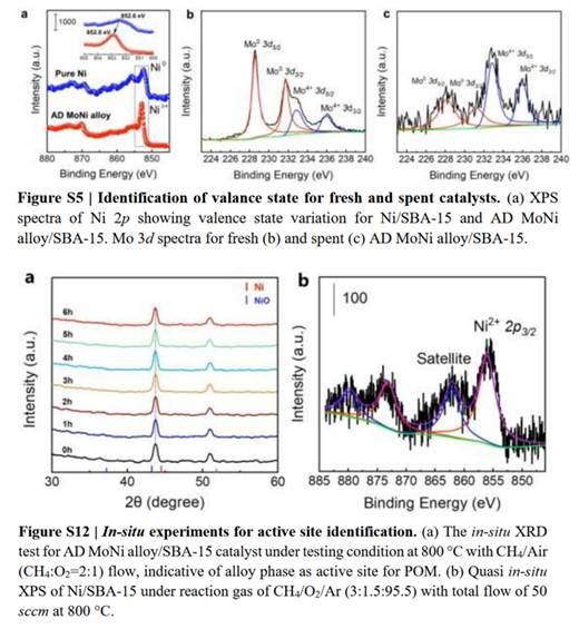 用XPS表征原子分散MoNi合金催化剂的电子结构和表面化学状态。通过分析Ni的XPS谱图,发现Ni与Mo之间存在电子转移(Ni的电子态向Mo偏移),证实了合金结构的形成。此外,准原位XPS实验揭示了反应后Ni的氧化态变化:纯Ni催化剂表面Ni0转化为NiO,导致过氧化问题;而MoNi合金中Mo的引入抑制了Ni的氧化,维持了金属态Ni的稳定活性位点。XPS还通过结合能变化验证了Mo的氧亲和特性如何优化O*物种的吸附强度,从而调控甲烷部分氧化路径。