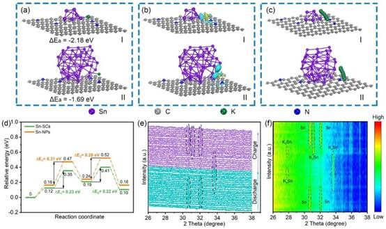 采用电化学原位XRD阐明SnSC @MCNF电极的钾化和脱钾过程中的合金化反应机制。在初始放电阶段,中心位于30.6°和32.0°左右的典型衍射峰为金属锡。随着Sn-SC @MCNF阳极的钾化,在2θ=33.6°附近出现一个与KxSn相相关的衍射峰。充电过程后期,KxSn的信号又逐渐变弱,同时,锡峰再次出现,表现出良好的电化学可逆性。原位电化学XRD证实了钾与锡的可逆合金化的发生。