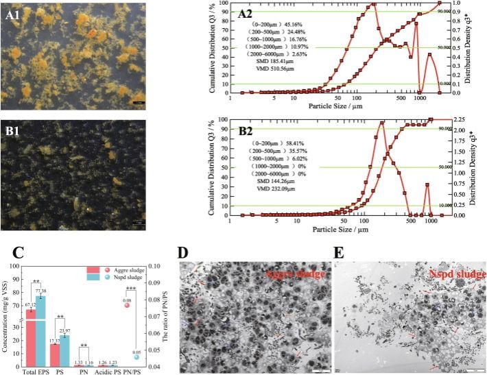 已知厌氧氨氧化细菌的自发聚集能够增强其活性和生长,但其调控机制仍不清楚。通过使用两个厌氧氨氧化反应器进行研究:Nspd反应器(添加聚集抑制剂 norspermidine)和Aggre反应器(对照组,未添加抑制剂)。在155天的培养后,用激光粒度仪测了污泥的平均粒径,Nspd反应器中的污泥平均粒径(232.09 μm)显著小于Aggre反应器中的污泥(510.56 μm),表明norspermidine有效抑制了细菌的聚集。通过实验与多组学分析结合,系统揭示了厌氧氨氧化细菌聚集状态对其氮代谢活动的调控机制。这些发现揭示了厌氧氨氧化细菌聚集是通过群体感应信号和第二信使调控其氮代谢活性,从而最终增强其活性和生长速率的机制。